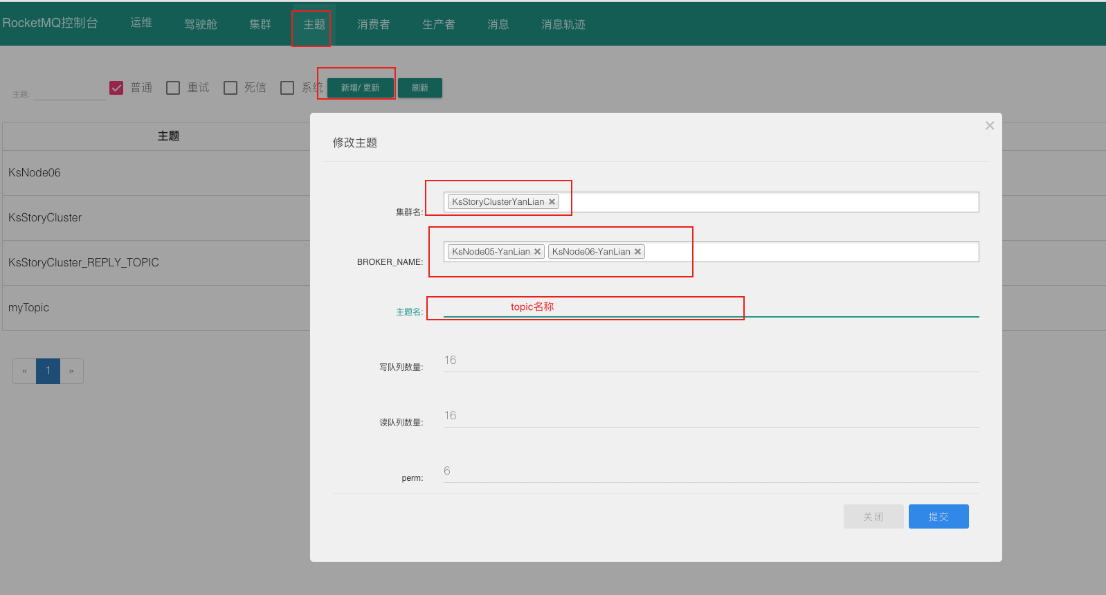1 mqadmin updateTopic -c KsStoryClusterYanLian -n '10.6.28.242:9876;10.6.230.74:9876;10.6.174.144:9876;10.6.40.117:9876;10.6.120.17:9876;10.6.119.79:9876' -t gph -r 16 -w 16