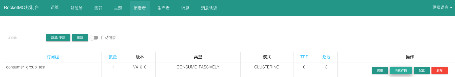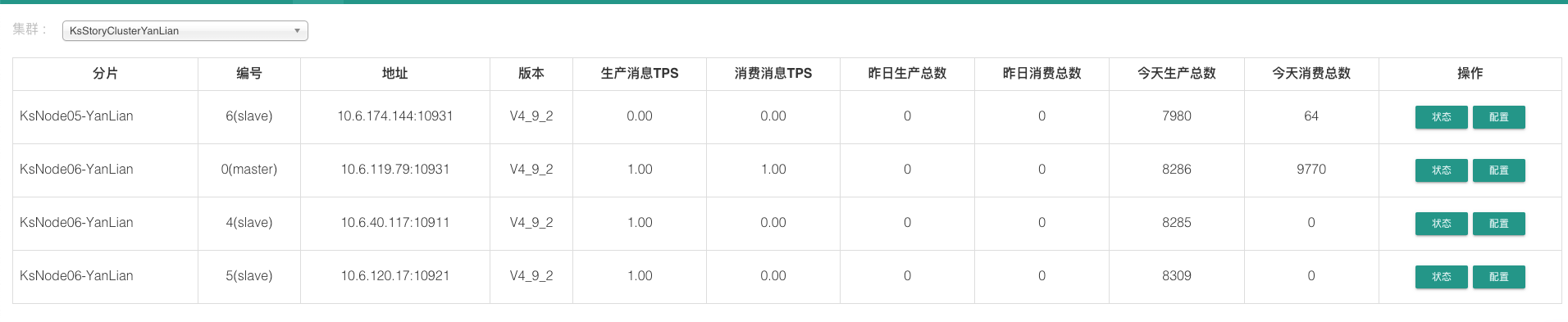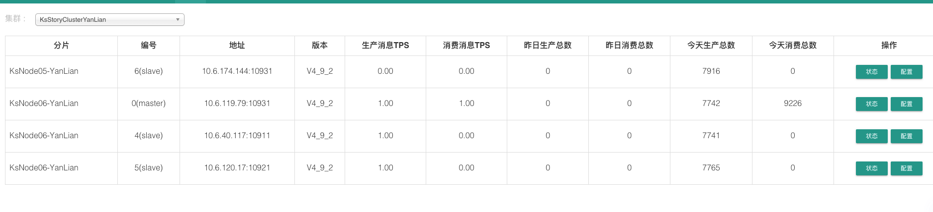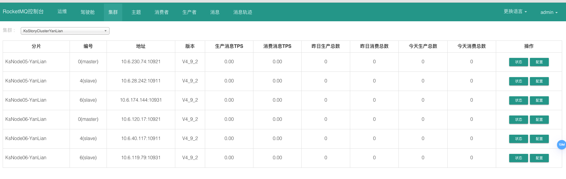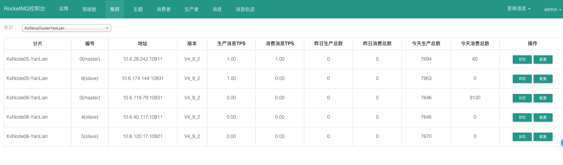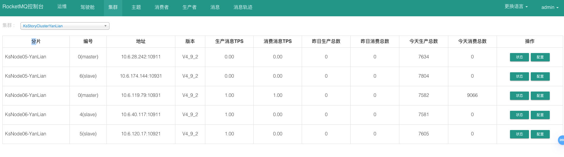 命令行验证集群状态 1 2 3 4 5 6 7 8 9 10 11 12 # 设置nameserver地址 export NAMESRV_ADDR="10.6.28.242:9876;10.6.230.74:9876;10.6.174.144:9876;10.6.40.117:9876;10.6.120.17:9876;10.6.119.79:9876" cd /usr/local/rocketmq-4.9.2/bin/ ./mqadmin clusterList #Cluster Name #Broker Name #BID #Addr #Version #InTPS(LOAD) #OutTPS(LOAD) #PCWait(ms) #Hour #SPACE KsStoryClusterYanLian KsNode05-YanLian 0 10.6.230.74:10921 V4_9_2 0.00(0,0ms) 0.00(0,0ms) 0 478442.56 0.0900 KsStoryClusterYanLian KsNode05-YanLian 4 10.6.28.242:10911 V4_9_2 0.00(0,0ms) 0.00(0,0ms) 0 478442.56 0.1000 KsStoryClusterYanLian KsNode05-YanLian 6 10.6.174.144:10931 V4_9_2 0.00(0,0ms) 0.00(0,0ms) 0 478442.56 0.0900 KsStoryClusterYanLian KsNode06-YanLian 0 10.6.120.17:10921 V4_9_2 0.00(0,0ms) 0.00(0,0ms) 0 478442.56 0.0900 KsStoryClusterYanLian KsNode06-YanLian 4 10.6.40.117:10911 V4_9_2 0.00(0,0ms) 0.00(0,0ms) 0 478442.56 0.0900 KsStoryClusterYanLian KsNode06-YanLian 6 10.6.119.79:10931 V4_9_2 0.00(0,0ms) 0.00(0,0ms) 0 478442.56 0.0900