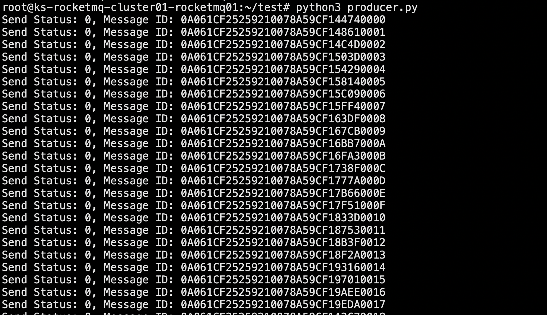 生产者脚本 1 2 3 4 5 6 7 8 9 10 11 12 13 14 15 16 17 18 19 20 21 22 23 24 25 # producer.py from rocketmq.client import Producer, Message import time def main(): producer = Producer('producer_group_test') producer.set_name_server_address('10.6.28.242:9876;10.6.230.74:9876;10.6.174.144:9876;10.6.40.117:9876;10.6.120.17:9876;10.6.119.79:9876') # 替换为你的 NameServer 地址 producer.start() num = 0 while True: msg = Message('myTopic') msg.set_keys('key%s' % num ) msg.set_tags('tag%s' % num) msg.set_body('Hello RocketMQ %s' % num) ret = producer.send_sync(msg) print(f'Send Status: {ret.status}, Message ID: {ret.msg_id}') num += 1 time.sleep(1) producer.shutdown() if __name__ == "__main__": main()