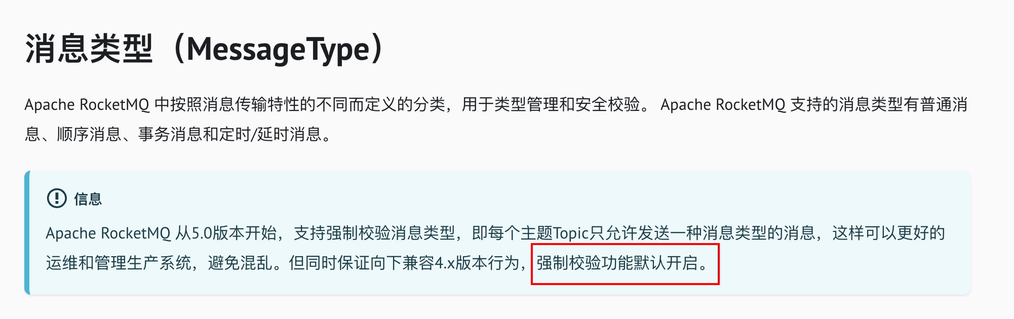 默认5.0开始 开启了强制校验功能 每个topic 只允许发送一种消息类型的消息 为兼容4.x 需要关闭校验消息类型
